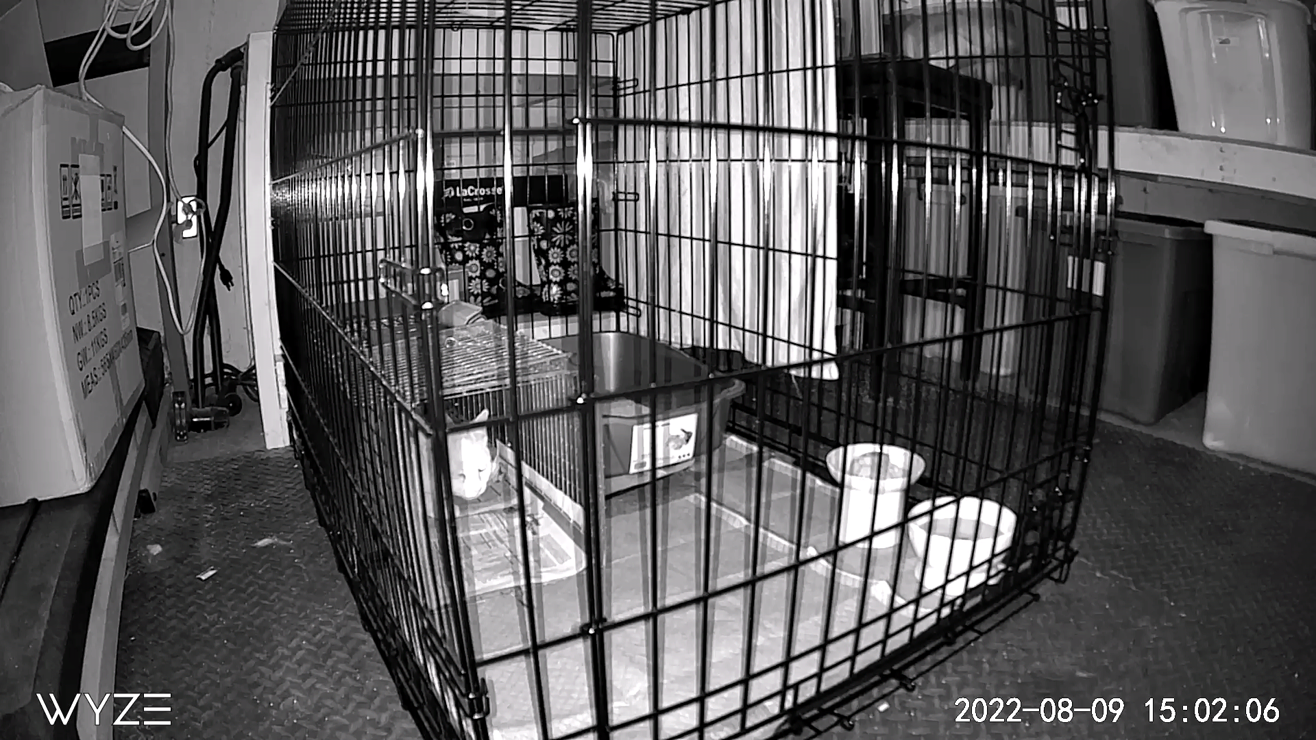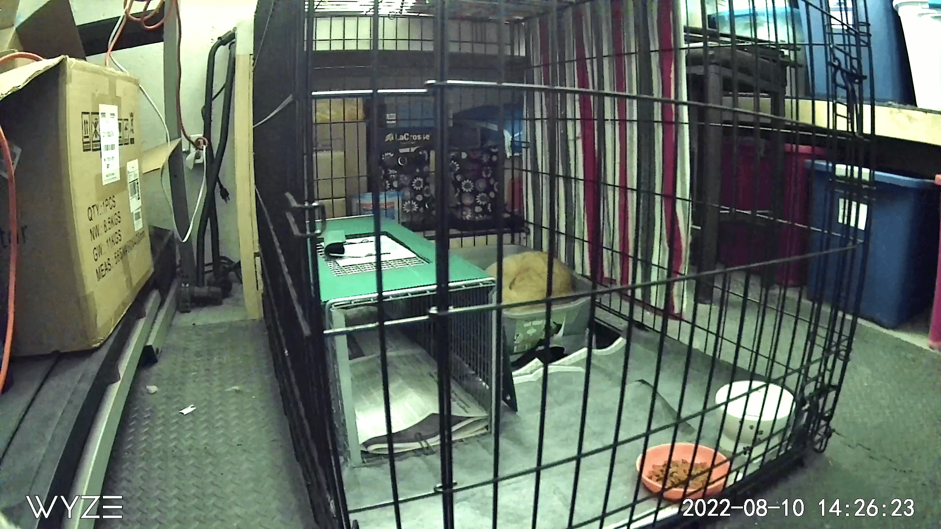 The first 2 photos, are of him, right after we brought him home and put him in the crate, leaving food and water for him. In the 3rd photo, he got up and was trying to find a way out, in the process knocking water around and moving the pee pads around in the crate. I went down at about 3 am and left him food, and a little more water. When I checked in the morning, he had not eaten any of it. In the 4th and 5th photos, he is laying in the litter box, after I had cleaned it all up, and put down some dry food, and water. The last photo is after he go up, stretched, and repositioned himself to sleep in the litter box. I hope at some point he gets up or at least drinks water. I am getting worried about him. I wish there was a way for me to reassure him, but I think it will just take some time.