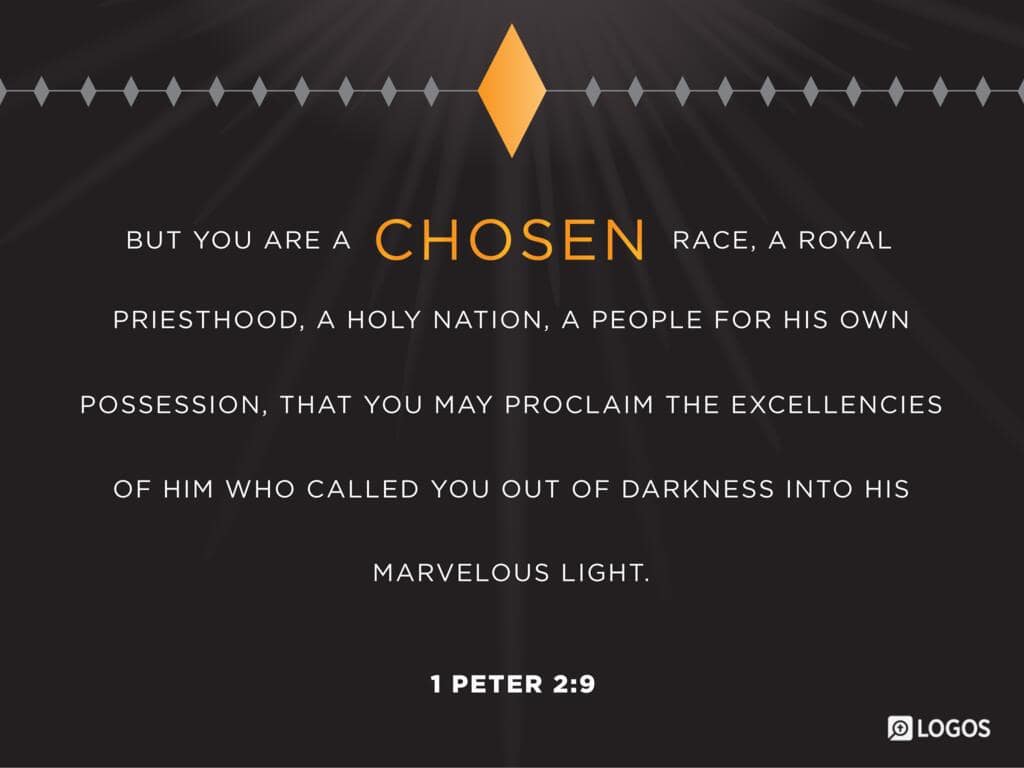1 Peter 2:9 [ESV]: 9 But you are a chosen race, a royal priesthood, a holy nation, a people for his own possession, that you may proclaim the excellencies of him who called you out of darkness into his marvelous light.