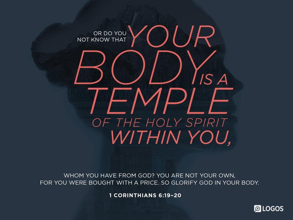 1 Corinthians 6:19–20 [ESV]: 19 Or do you not know that your body is a temple of the Holy Spirit within you, whom you have from God? You are not your own, 20 for you were bought with a price. So glorify God in your body.