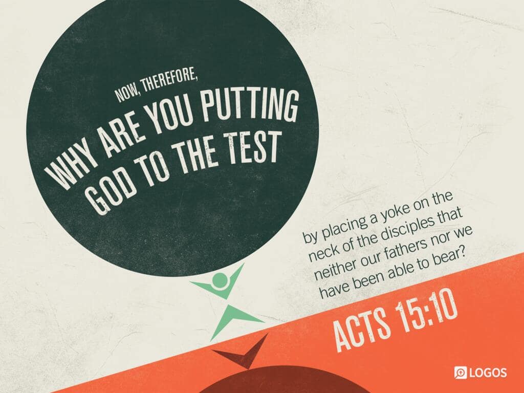 Acts 15:10–11 [ESV]: 10 Now, therefore, why are you putting God to the test by placing a yoke on the neck of the disciples that neither our fathers nor we have been able to bear? 11 But we believe that we will be saved through the grace of the Lord Jesus, just as they will.”