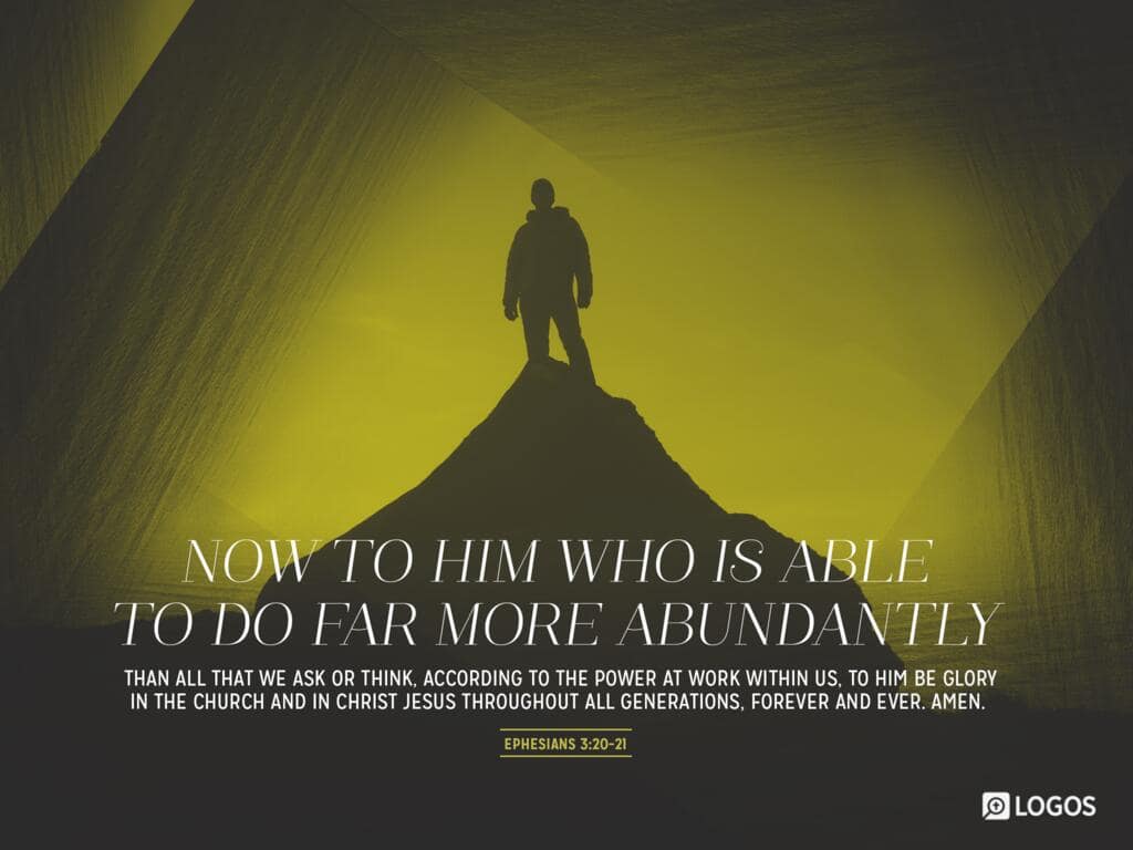 Ephesians 3:20–21 [ESV]: 20 Now to him who is able to do far more abundantly than all that we ask or think, according to the power at work within us, 21 to him be glory in the church and in Christ Jesus throughout all generations, forever and ever. Amen.