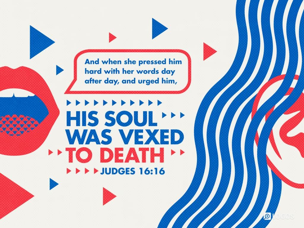 Bible, Faith, Family, Friends, God, Health, Internet, Life, Love, Personal, Pets, Prayer, Religion, Social Media, Website Judges 16:16 [ESV] January 28, 2026January 28, 2026 / Emily/ Leave a comment https://ref.ly/Jdg16.16;esv Judges 16:16 [ESV]: 16 And when she pressed him hard with her words day after day, and urged him, his soul was vexed to death. Share this: Share on Facebook (Opens in new window) Facebook Share on X (Opens in new window) X Tags: Bible, Bible Verse, Cats, Dogs, Faith, God, Jesus, Jesus Christ, Lord, Prayer, Religion
