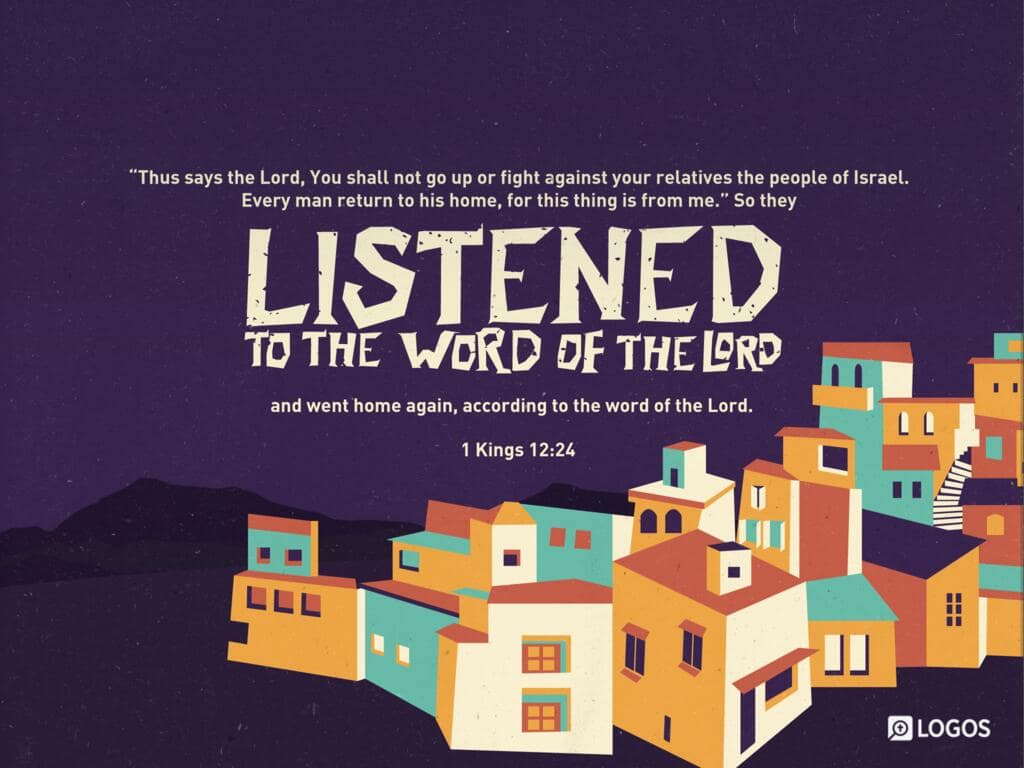 1 Kings 12:24 [ESV]: 24 ‘Thus says the LORD, You shall not go up or fight against your relatives the people of Israel. Every man return to his home, for this thing is from me.’ ” So they listened to the word of the LORD and went home again, according to the word of the LORD.
