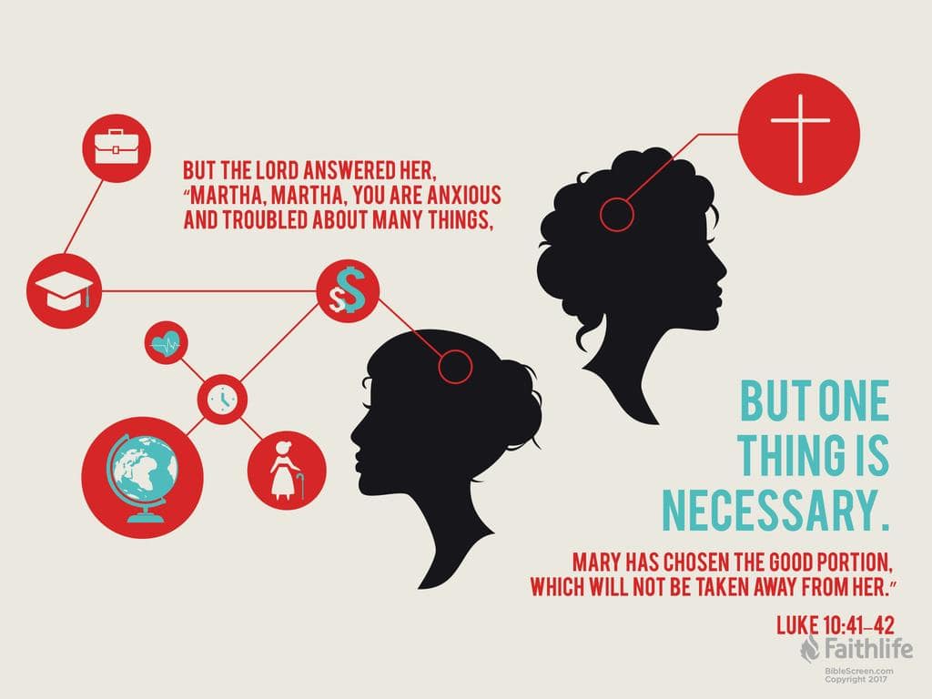 Luke 10:41–42 [ESV]: 41 But the Lord answered her, “Martha, Martha, you are anxious and troubled about many things, 42 but one thing is necessary. Mary has chosen the good portion, which will not be taken away from her.”