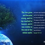 https://ref.ly/Da4.11-12;esvDaniel 4:11–12 [ESV]: 11 The tree grew and became strong, and its top reached to heaven, and it was visible to the end of the whole earth. 12 Its leaves were beautiful and its fruit abundant, and in it was food for all. The beasts of the field found shade under it, and the birds of the heavens lived in its branches, …